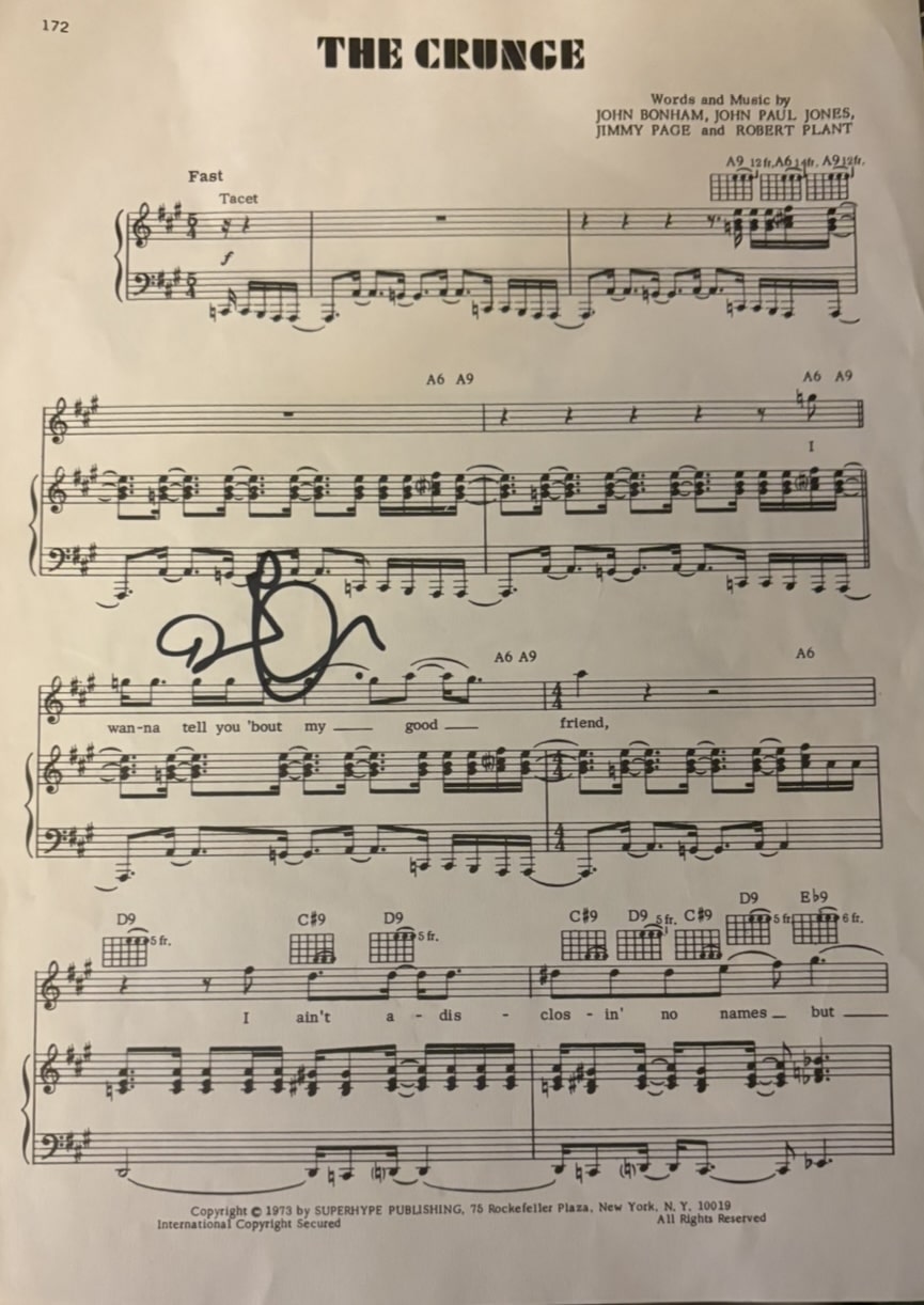 A page of sheet music (The Crunge), autographed by Robert Plant of Led Zeppelin.