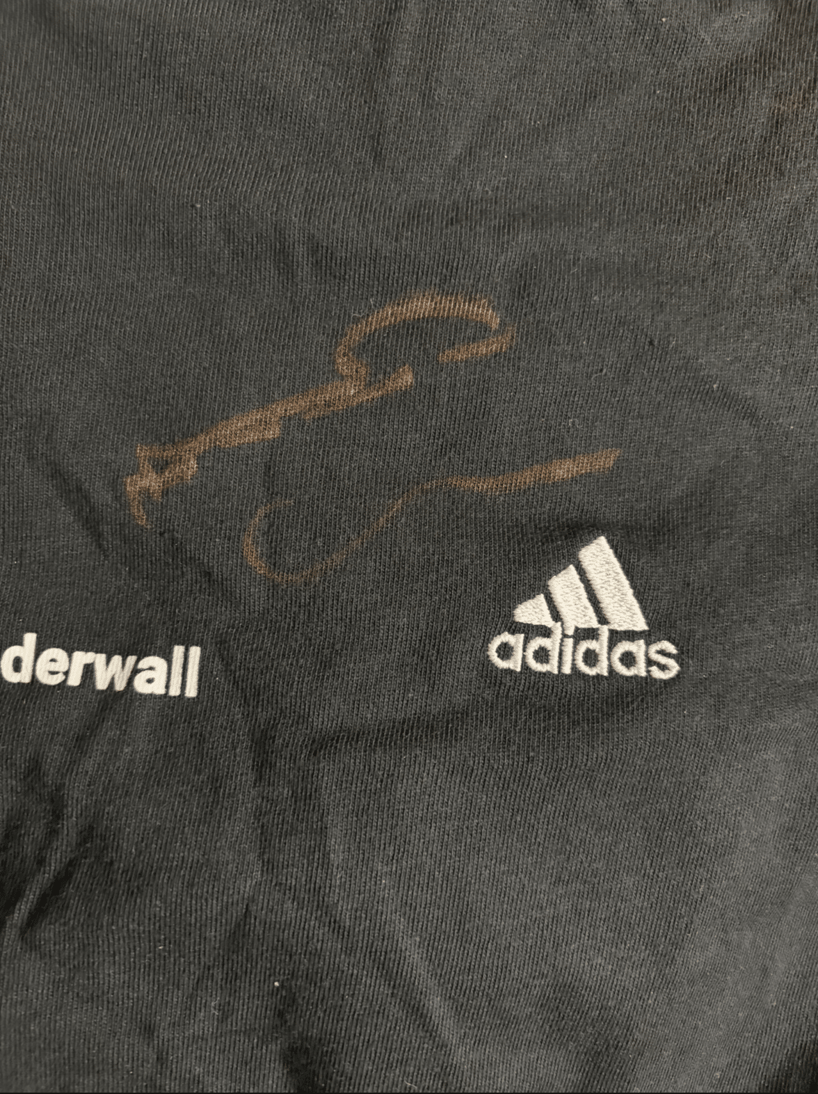 An official adidas t-shirt, autographed by Noel Gallagher of Oasis. Signing on front of shirt in sharpie pen.