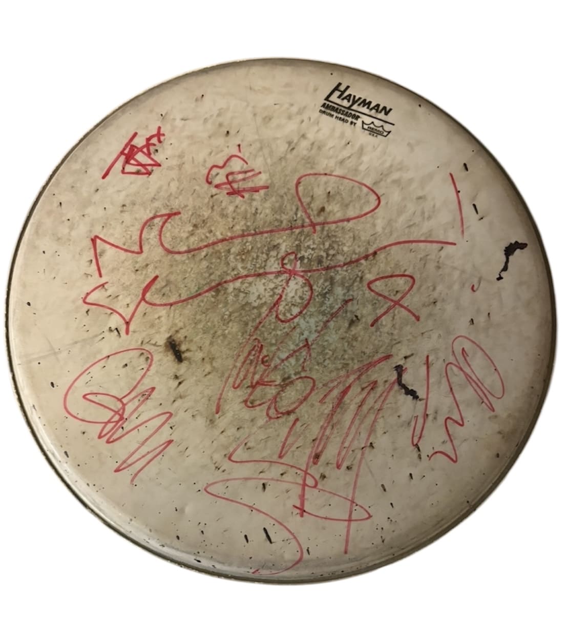 A drumskin, autographed by Noel Gallagher, Liam Gallagher, Andy Bell, Gem Archer, Jay Darlington and Alan White of Oasis. Very nice example of classic Oasis autographs.
