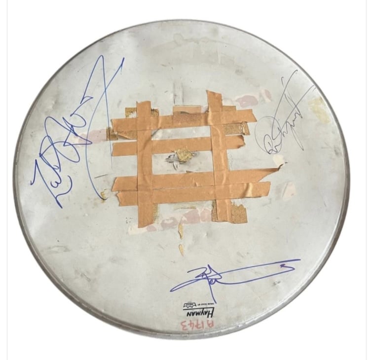 A drumskin, autographed by Roger Daltrey, Pete Townshend and Zak Starkey of The Who.