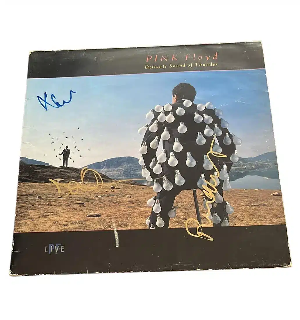 A vinyl LP (Delicate Sound Of Thunder), autographed by Nick Mason, David Gilmour and Richard Wright of Pink Floyd. A nice Gilmour signing, classic flow and shape to autograph. Wright’s autograph is standard, good shape and form. The Mason autograph is quite short, some evident rushing, typical handwriting and letter shape can be seen.