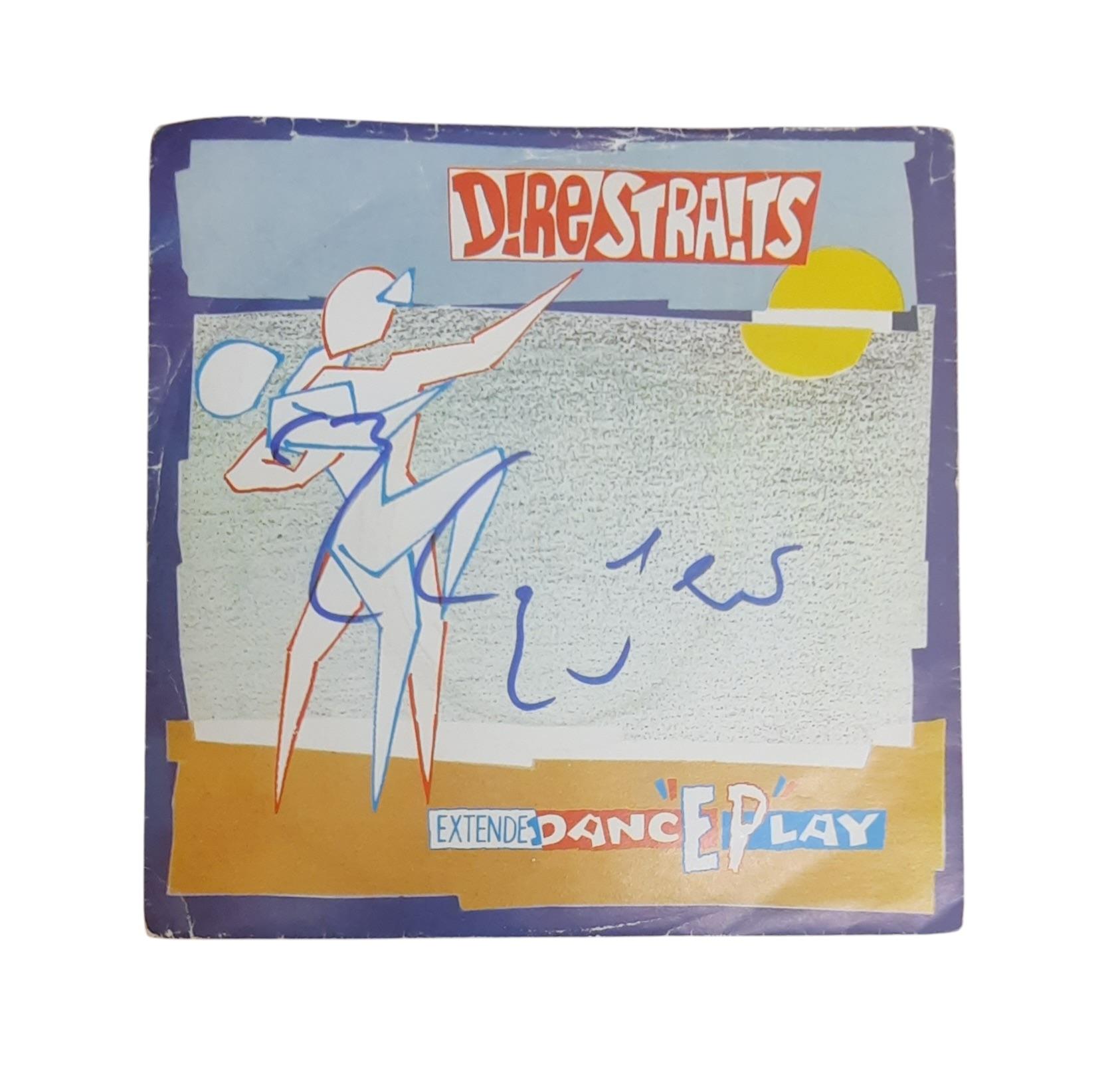 A 7″ vinyl 45 (Extended Dance Play), autographed on the front of the vinyl cover by Mark Knopfler of Dire Straights. Typical Mark Knopfler shaping, his unique style present and no signs of counterfeit.