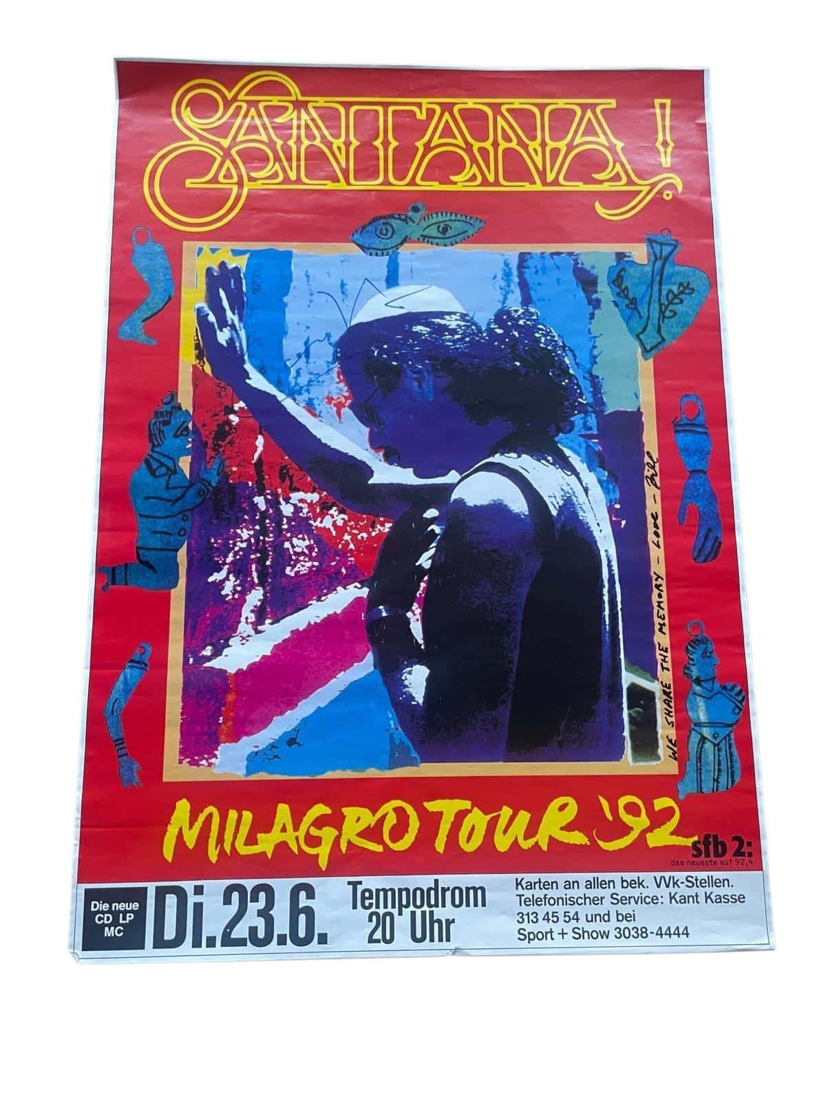 A poster (Berlin 1992 Original Tour Poster), autographed by Carlos Santana. A simple, short Santana signing. Good alignment with other genuine examples. A unique piece considering the medium.
