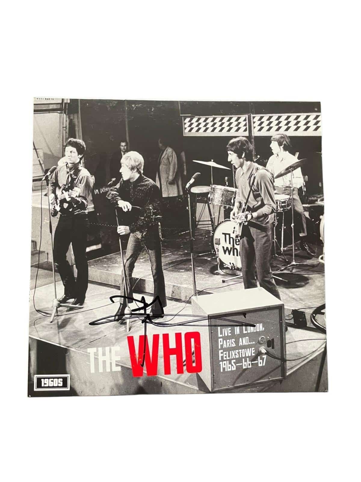 A vinyl LP (The Who Live), autographed on the front of the vinyl cover in black marker pen by Pete Townshend of The Who. A well shaped Townshend example, great pen flow and no unnecessary hesitation or pen stop marks.