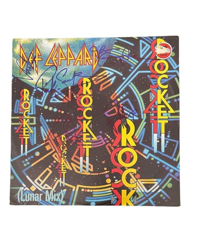 A 12″ vinyl (Rocket), autographed on the front of the vinyl cover in blue marker pen by Rick Allen, Rick Savage, Phil Collen, Vivian Campbell and Joe Elliott of Def Leppard. A remarkable and distinguised set of Def Leppard autographs. Stylistically, all autographs are presented as expected. There is very little to fault here in terms of pen flow, shape accuracy and presentation. No notable smudging or blurring on the pen strokes.