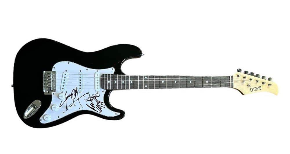 An electric guitar, autographed on the pickguard by Jerry Only, Dez Cadena and Robo of Misfits. A beautiful full Only autograph, accompanied by completely typical and fluid , slightly overlapping Dez Cadena and Robo signings. Handwriting and lettering a complete match.