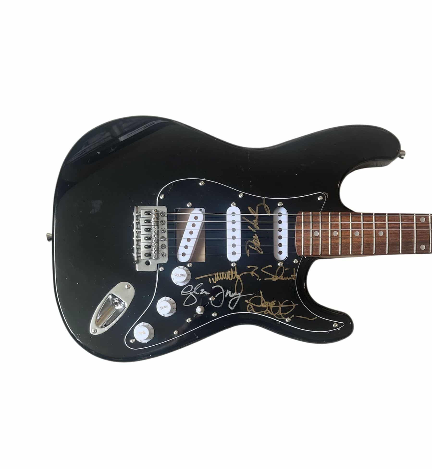 An electric guitar, autographed on the pickguard by Don Henley, Timothy B Schmit, Glenn Frey and Joe Walsh of the Eagles. Solid pen flow with no hesitation seen, slight wavering in form on the Walsh signing, likely due to the shape of medium. Distinguished and recognizable autographs.