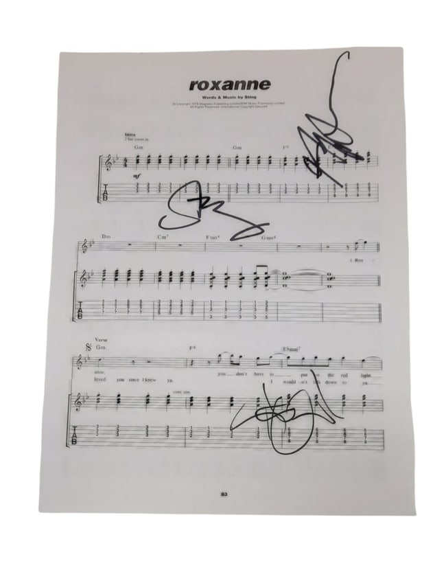 A page of sheet music (Roxanne), autographed by Sting, Andy Summers and Stewart Copeland of The Police.