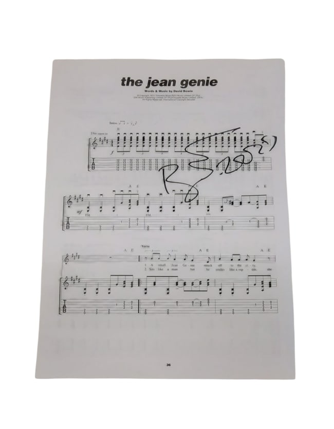 A page of sheet music (The Jean Genie), autographed by David Bowie. Nice classic Bowie signing. Possibly dated 2009, although not conclusive. Autograph is clear in black sharpie.