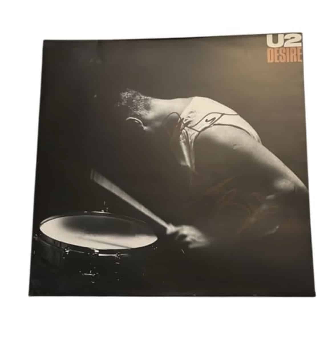 A 12″ vinyl (Desire), autographed on the front of the vinyl cover in black marker pen by Bono of U2. Autograph includes self portrait drawing, as seen accompanying other genuine Bono examples. Good shape, flow and pen pressure consistency.