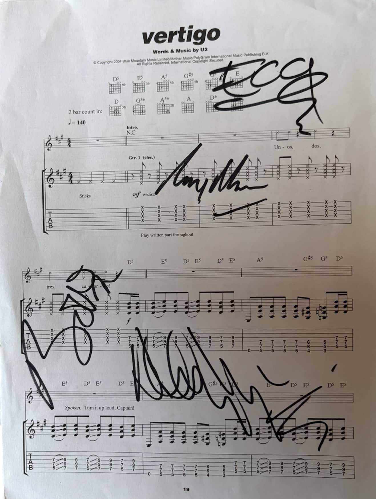 A page of sheet music (Vertigo) autographed by Bono, The Edge, Larry Mullen Jr and Adam Clayton of U2. Good clear and clean examples from all four members. Speed, pressure and size all as would be expected.