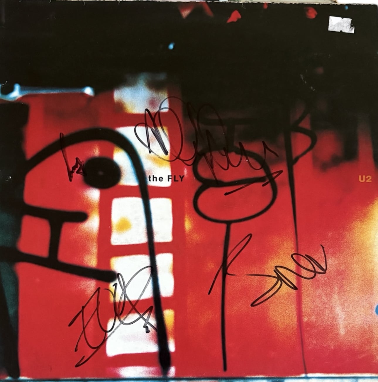 12″ Vinyl (The Fly) autographed by Bono, The Edge, Larry Mullen Jr and Adam Clayton of U2. Good clear and clean examples from all four members on the front of the vinyl. Most of the signing fall within the lighter section of the artwork, making this a very nice example. Speed, pressure and size all as would be expected.