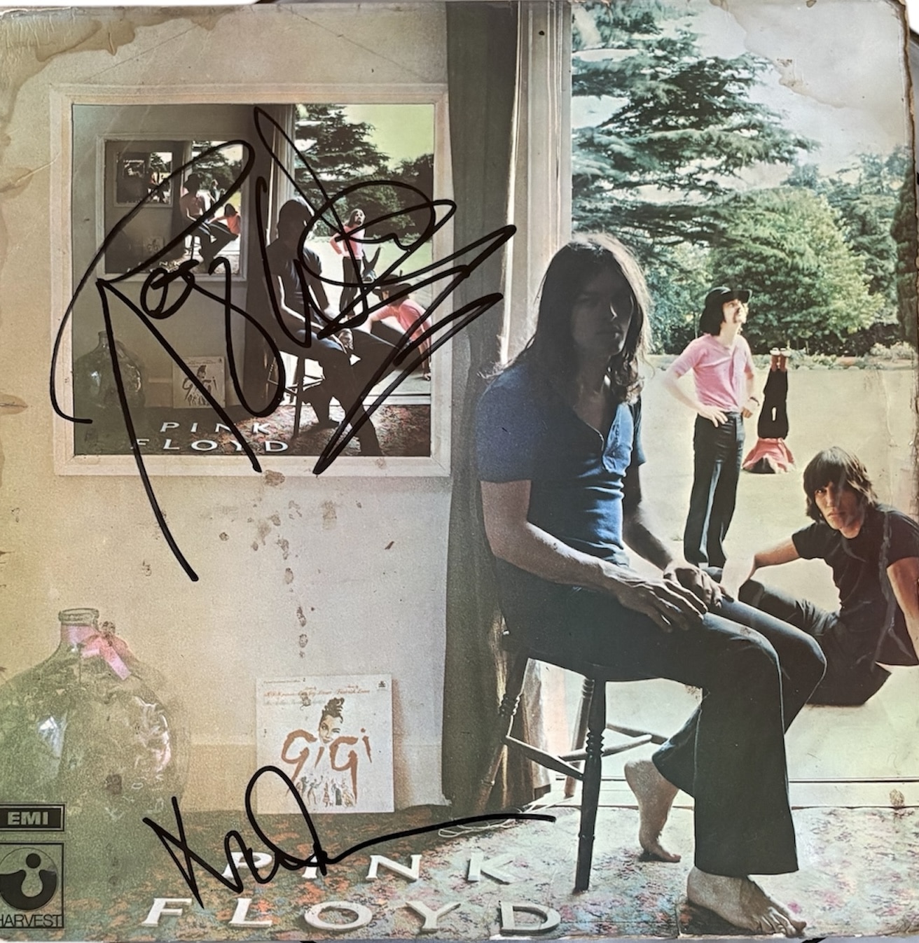 A vinyl LP (Ummagumma) autographed by Roger Waters and Nick Mason of Pink Floyd. Good duo of Floyd autographs. Full name signings. Mason a little rushed but still a good example. Waters very nice.