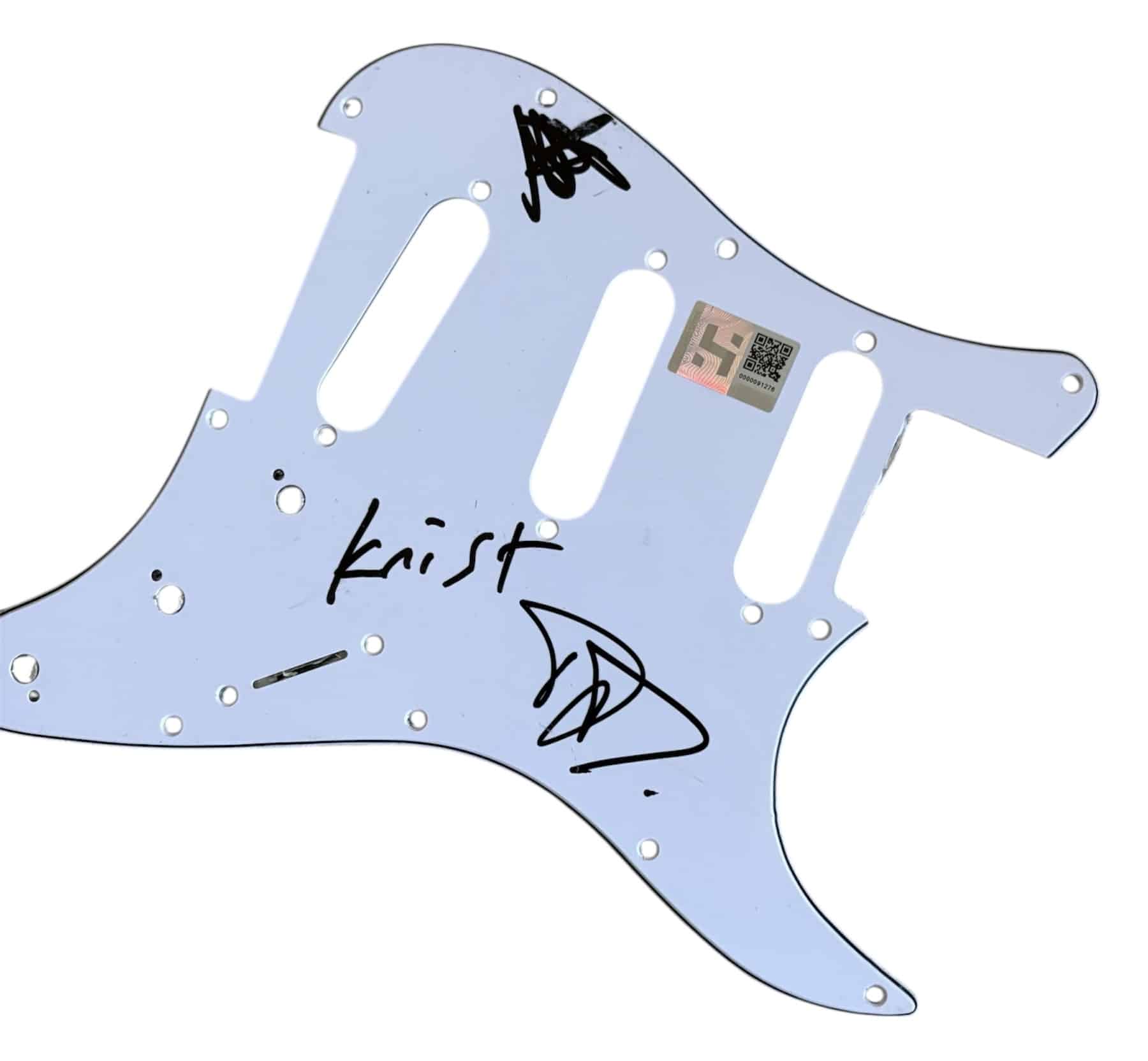 An electric guitar, autographed by Dave Grohl, Krist Novoselic and Pat Smear of Nirvana. Nice set of Nirvana autographs. Really good examples of their contemporary styles.