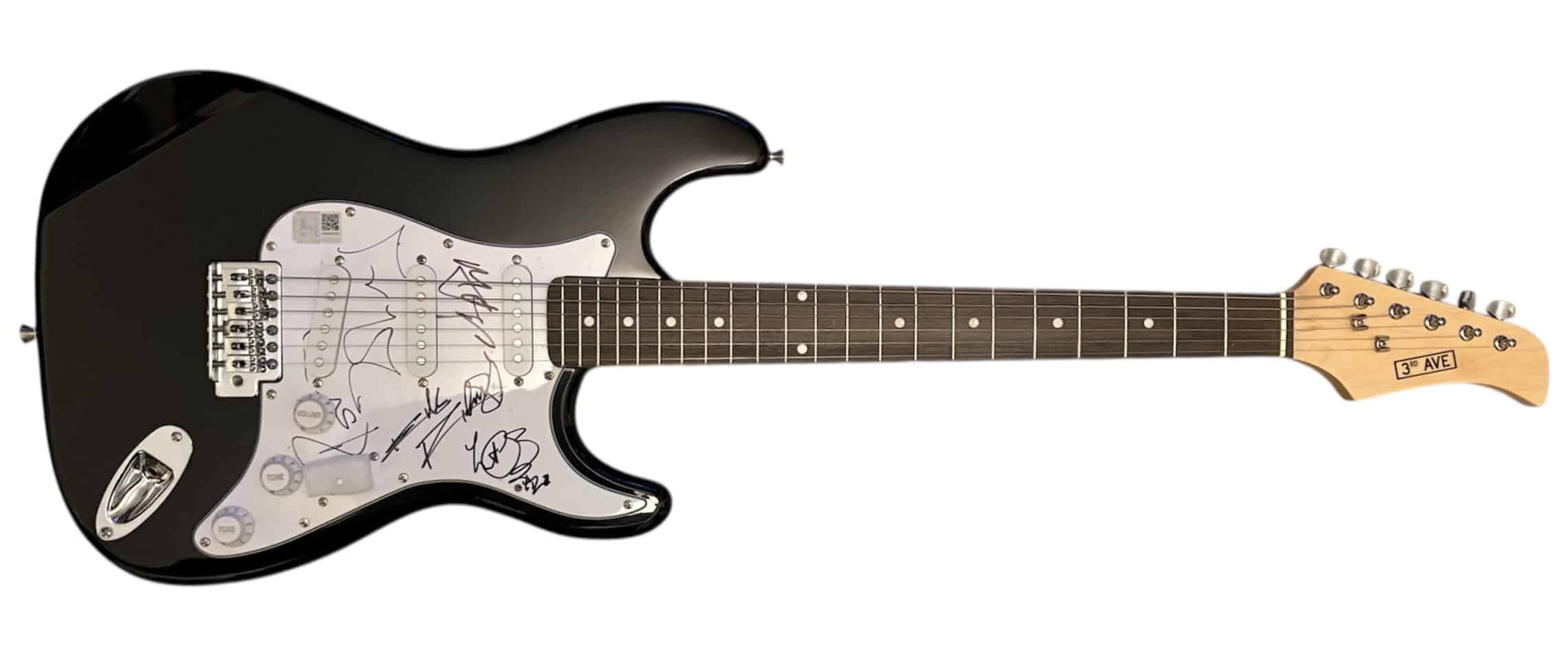 An electric guitar, autographed by Mick Jagger, Keith Richards, Ronnie Wood and Charlie Watts of The Rolling Stones. Really solid set of Stones autographs. Lovely positioning and shape, size and style of autographs are excellent.