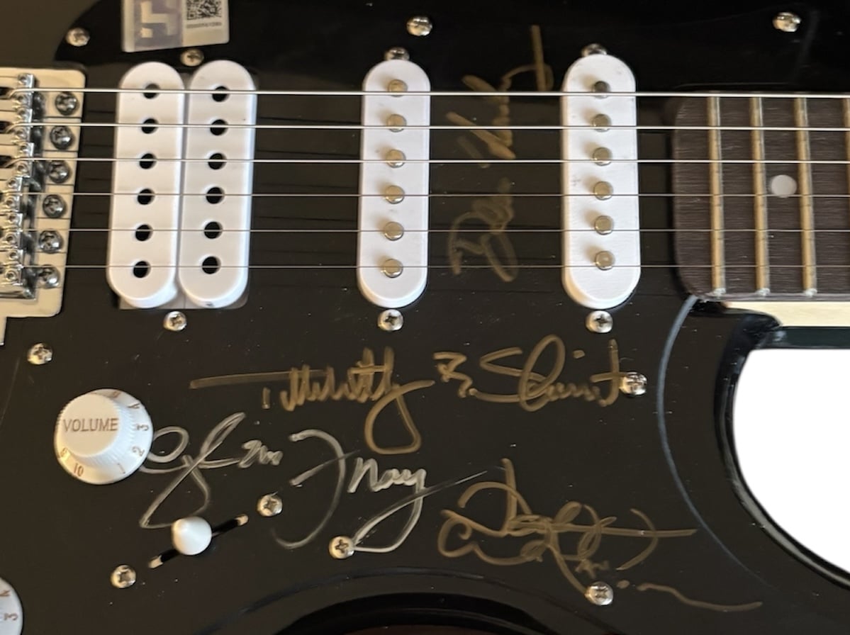 An electric guitar, autographed by Don Henley, Joe Walsh, Timothy B Schmit and Glenn Frey of The Eagles. Lovely clean set of Eagles autographs, all signed on the guitar scratchplate. Nice examples.