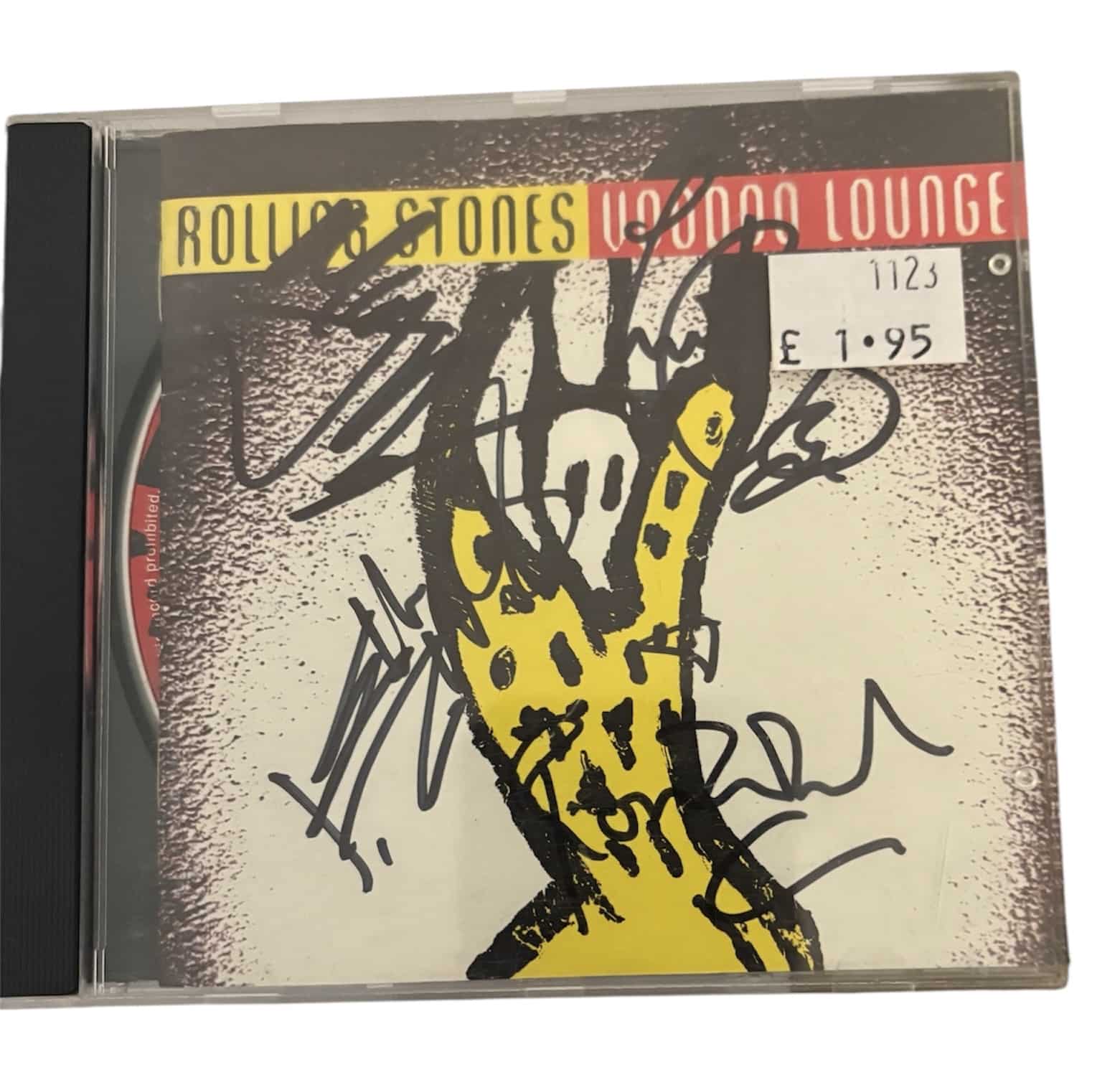 A CD (Voodoo Lounge), autographed on the front of the CD sleeve by Keith Richards, Mick Jagger, Charlie Watts and Ronnie Wood of The Rolling Stones. Nice Stones autographs. Lovely positioning and shape, size and style of autographs are impressive.