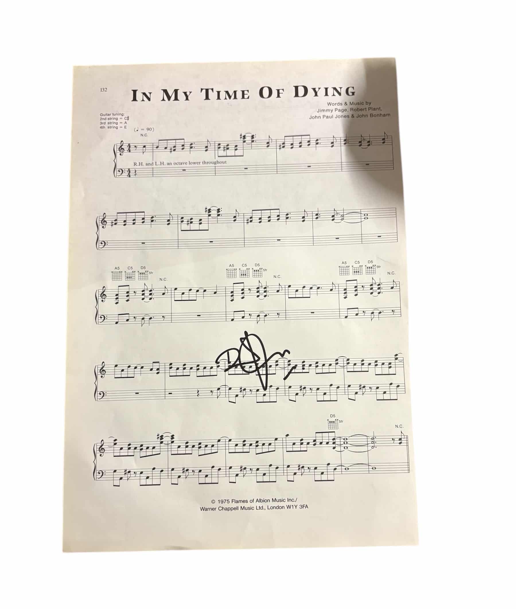 Sheet music (In My Time Of Dying) autographed by Robert Plant of Led Zeppelin. Very clean nice example of a modern Plant signing.