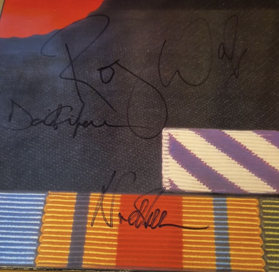 A vinyl LP (The Final Cut) autographed by Roger Waters, Nick Mason and David Gilmour of Pink Floyd. Nice set of three Floyd autographs. Waters is a lovely full name example. Gilmour is a very good signing. Mason slightly rushed but still a good example.