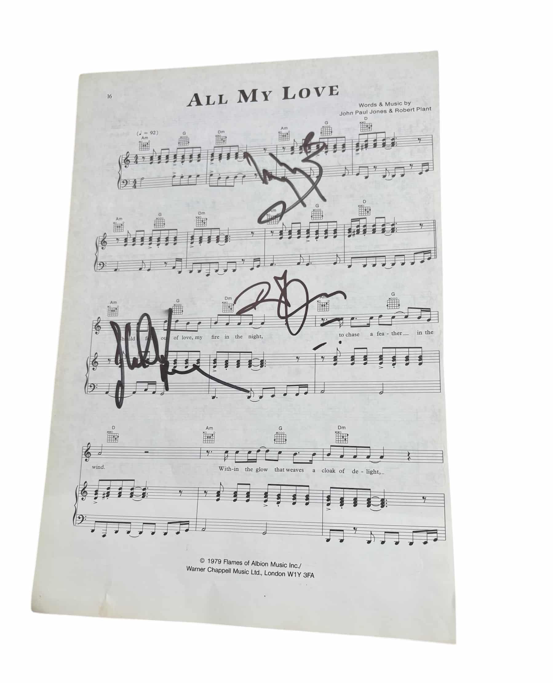 Sheet music (All My Love) autographed by Robert Plant, Jimmy Page and John Paul Jones of Led Zeppelin. Nice full set of Zeppelin autographs signed on the same page of sheet music. Good examples.