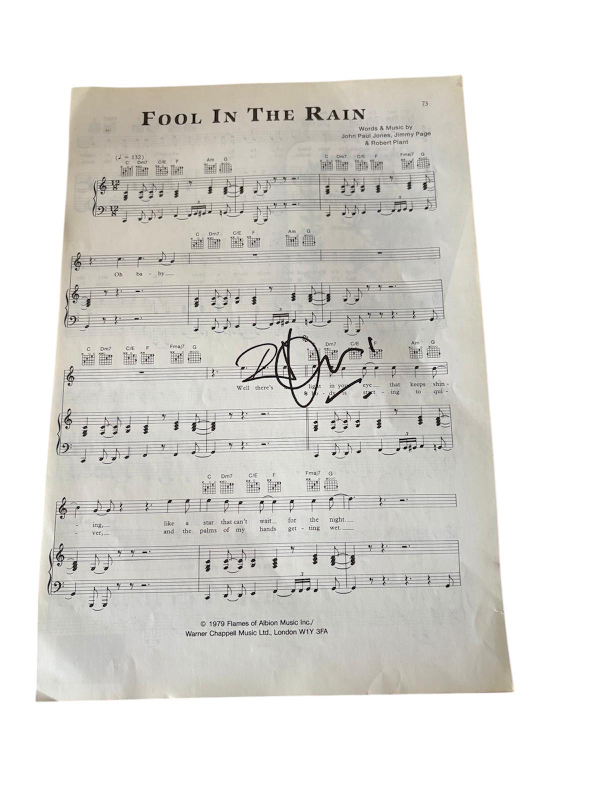 A page of sheet music (Fool In The Rain), autographed in black sharpie pen by Robert Plant of Led Zeppelin. A great, confident and well shaped Plant signing.