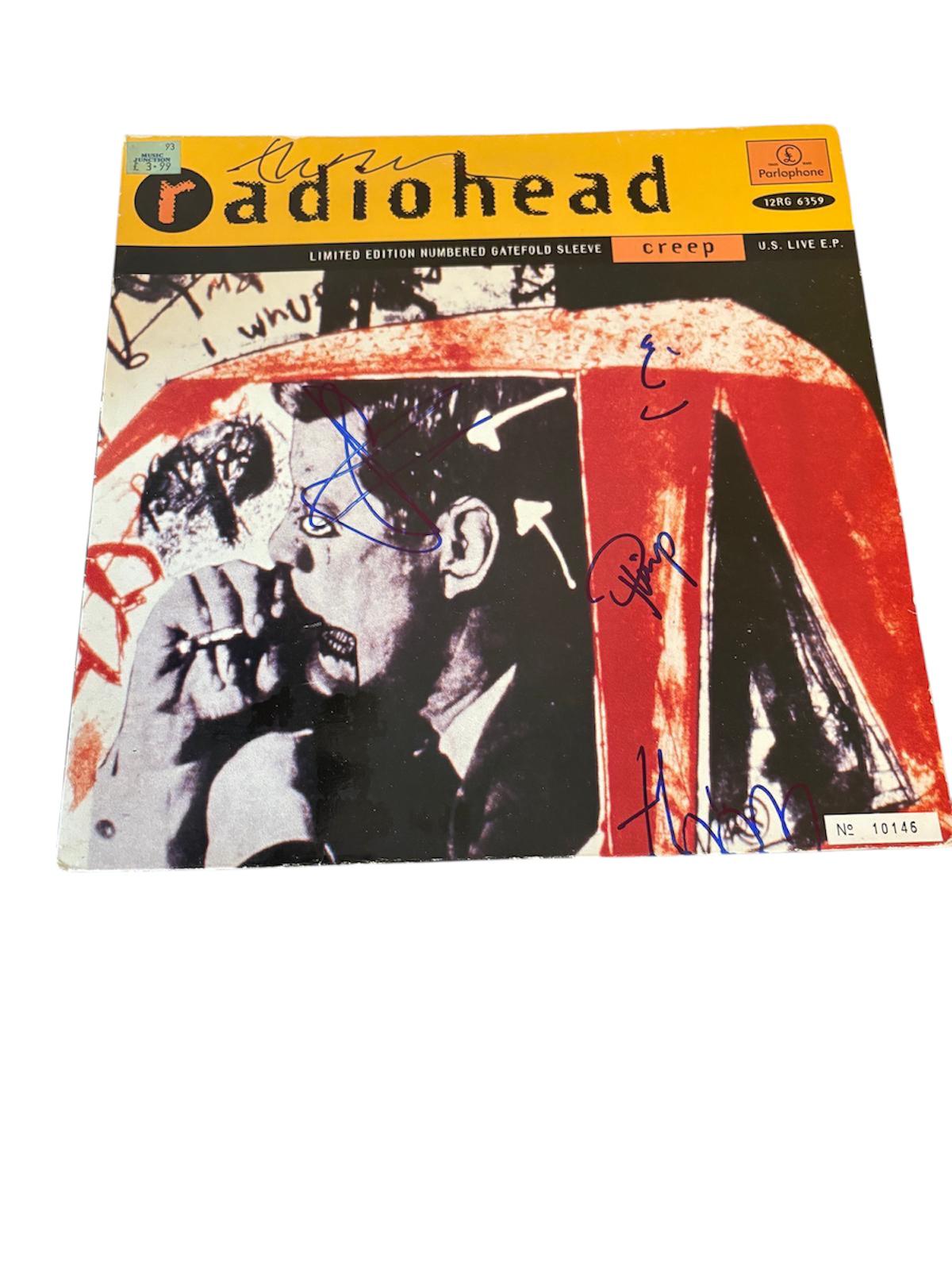 A 12″ vinyl (Creep), autographed by Thom Yorke, Ed O’Brien, Philip Selway, Johnny Greenwood and Colin Greenwood of Radiohead. Good and fluid Radiohead set, pen is bold and confident on all examples.