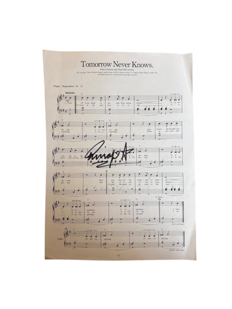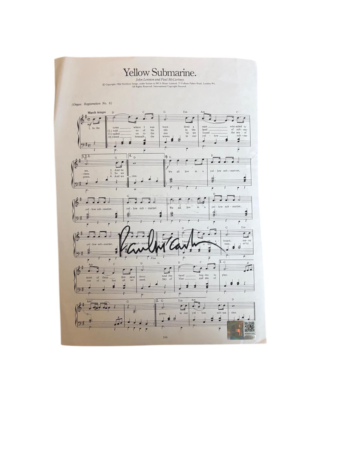A page of sheet music (Yellow Submarine), autographed by Paul McCartney of The Beatles, also autographed on the reverse by Ringo Starr (Tomorrow Never Knows), of The Beatles. McCartney example is textbook, with good likeness to other genuine samples. The Starr signing is very clean, with reference points of handwriting and the star flair comparing well to other genuine signings.